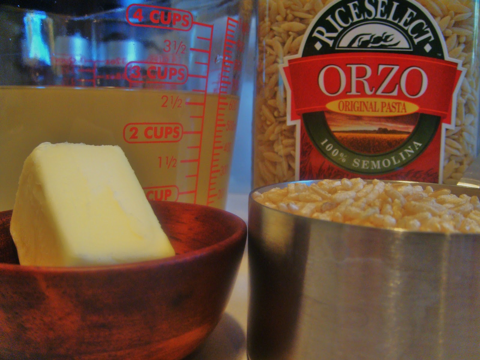 Your first step in this recipe is going to get your the golden brown rice you will need in rice pilaf. You will brown the orzo in butter until it is brown. It is pretty neat to see the transformation.